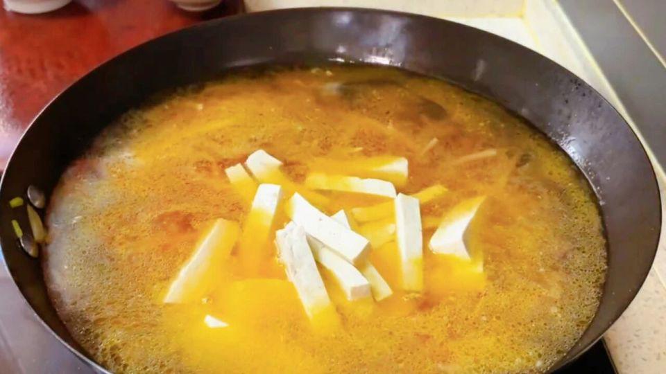 2,做这个汤我喜欢用老豆腐,多煮一会把豆腐的香味给煮出来特别香,切成粗一点的条就可以。